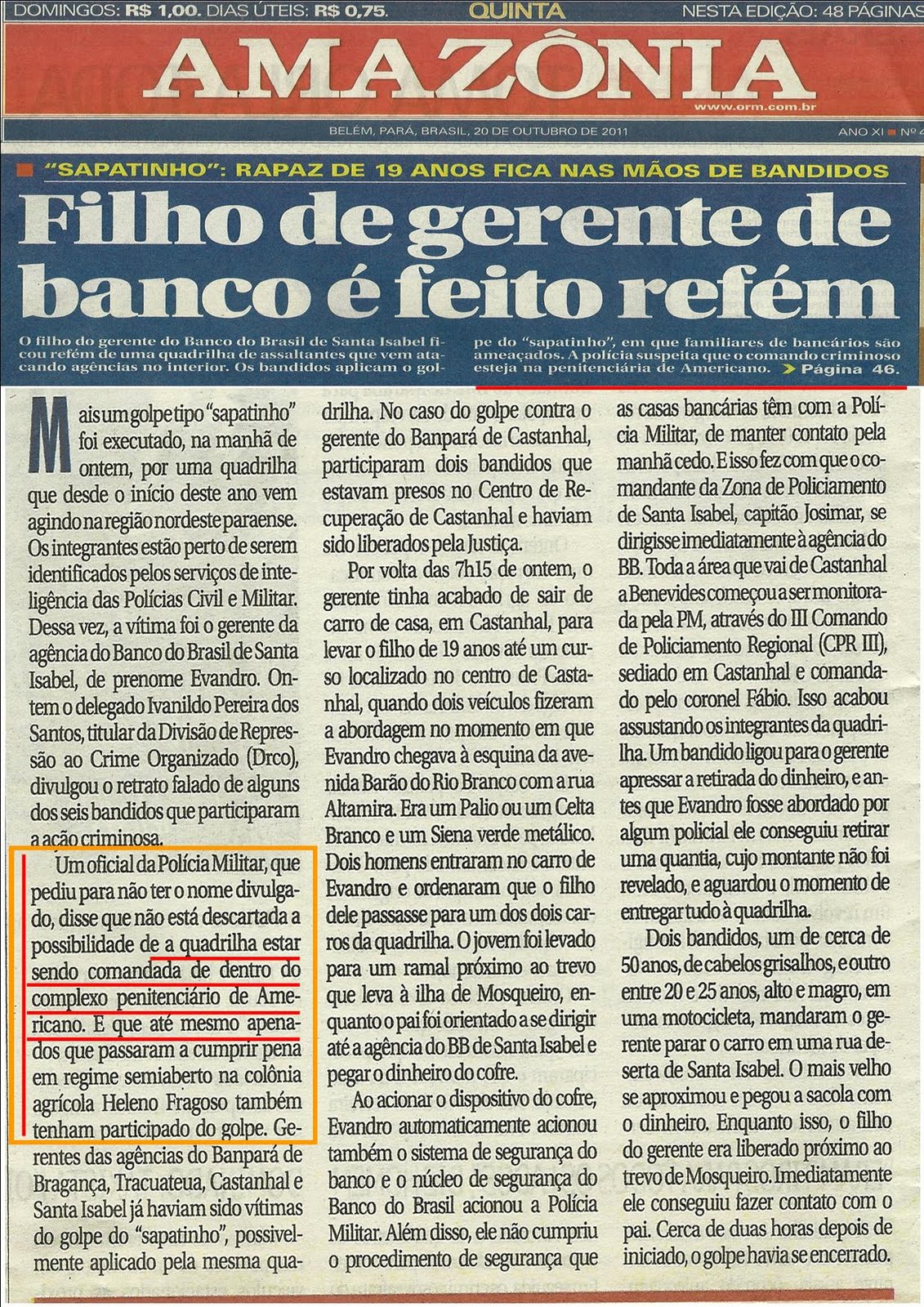 Este Comitê já declarou, e denunciou várias vezes que os a maioria dos crimes cometidos em Americano e Santa Izabel tem alguma relação com as Penitenciárias. Os últimos 3 homicídios em Americano envolveu ex detentos e familiares de detentos que cumprem pena nas casas penais, os assaltos ocorridos na comunidade a maioria são praticados por detentos do Colônia Agrícola Heleno fragoso, hoje mesmo dona Rosa foi surpreendida durante sua caminhada e teve seu celular roubado por um interno da Colônia Penal que continuam a vontade para sair a retornar a hora que bem entendem daquela casa penal que continua sem qualquer controle. A Chacina ocorrida em santa Izabel ninguém falou nada mais dos sete assassinados pelo menos dois tinham parentes cumprindo pena no Complexo Penitenciário em Americano, a menos de quinze dias dois internos fugiram da Colônia e asasinaram as esposas em santa Izabel e Ananindeua. Todos sabem que a crescente do tráfico e traficantes em Santa Izabel está intimamente ligado as Penitenciárias, todos lembram que a própria Juíza Dra Monica Titular da comarca de Santa Izabel denunciou em audiência Públicae foi destaque em matéria publicado pelos jornais do estado sobre a corrupção que impregnava o Sistema penal chegando a dizer que o Sistema penal do pará estava falído e que os detentos comandam os crimes em Santa Izabel de dentro das penitenciárias de Americano, logo depois foram presos diretores da SUSIPE por corrupção e por venda de alvará falsificados, em seguida o escândalo que revelou a farra dos detentos da Colônia heleno fragoso com realização de festas consumo de drogas facilidade para saírem e retornarem o que culminou com o estupro de uma adolescente de 14 anos dentro da casa penal , e agora a declaração de um policial que diz que os seqüestros e roubos ocorridos nas agências bancárias em santa Izabel são comandados por os internos de dentro das penitenciárias e que tem a participação dos que cumprem pena na Colônia Heleno Fragoso confirmando mais uma vez as denuncias dos integrantes deste Comitê e da Juíza Monica. Nós integrantes do Comitê Amo Americano que já denunciamos tudo isso a Justiça vamos continuar lutando pela paralisação da construção do CTM II e pela garantia de contrapartida para o Município e o Distrito da Americano principalmente na área de segurança pública. Veja as matérias publicadas pelos jornais Amazônia e Liberal.
