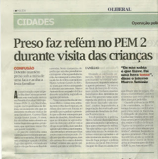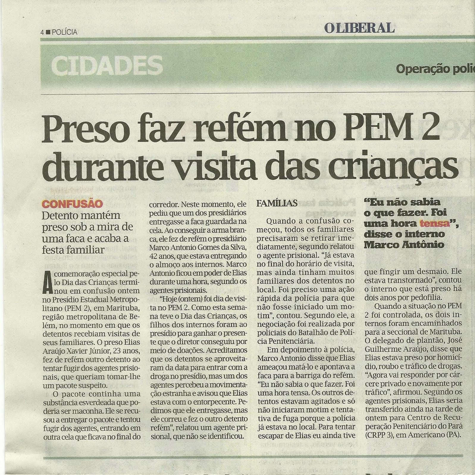 Presos fazem refém no PEM 2 em Marituba. Queimam colchões e destroem celas no PEM 1 em Santa Izabel (Americano). O pior é que as cidades que sediam as Casas Penais tem seus nomes manchados e estigmatizados pelas freqüentes matérias publicadas pelos jornais de circulação Estadual e até nacional. Veja matérias publicadas nos jornais