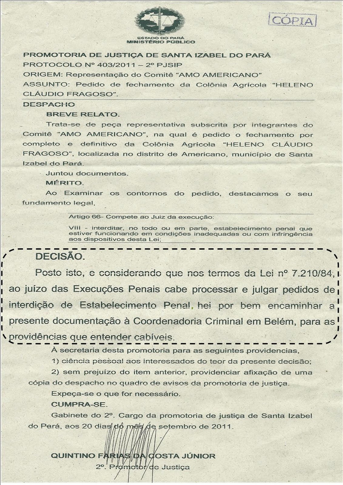 8. Por essas razões, considerando-se que ao Ministério Público incumbe a defesa da ordem jurídica (art. 127 CF) bem como promover a justiça requerem se digne V. Exa, em caráter de urgência, tomar todas as indispensáveis medidas para que o juiz da execução penal baseado no que lhe confere o art. 66 da LEP § VIII- determine o fechamento por completo e definitivo da Colônia Agrícola Heleno Fragoso no Distrito de Americano Município de Santa Izabel do Pará.