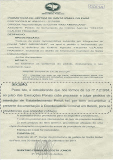14. As autoridades Constituídas (vice prefeito, vereadores Presidentes de associações e Sindicatos pastores e padres) bem como a OAB o Próprio Judiciário e a maioria da população do município de Santa Izabel tem se posicionado contrarias as construções Os jornais O liberal,e Amazônia, dos dias 12/05/2011 e 20/05/2011, noticiando a realização de campanhas audiências e manifestações contrárias à obra por parte dos izabelenses, a matéria do dia 12/05/2011 o liberal e AMAZONIA , noticia a resposta da Superintendência do sistema penal do estado SUSIPE, via assessoria de comunicação, onde se lê: “...A RESPOSTA a população do município tem ampla participação nas discussões... e será beneficiada com as construções.. pois haverá obras nas ares de segurança pública e saneamento...e aproveitamento da mão de obra local... ” as afirmações não condiz com a realidade os representantes da susipe tem discutido restritamente com o grupo político ligado ao governo e não com a população e seus representantes a prova é que nenhum representante do governo compareceu a audiência Pública realizada no dia 19/05/2011 (ANEXO: Ata da Audiência publica. E matéria do jornal Liberal 20/05/2011) ate o momento não se tem noticia de qualquer conversa ou convenio do Estado com a prefeitura que indique intenção de investimentos nas áreas de segurança pública e em saneamento, porem é freqüente e concreto o aumento da violência, a carência e a ausência de investimentos em infra estrutura (Anexo copio de matérias de jornais) em relação ao aproveitamento de mão de obra local o que houve foram dezenove destrato de funcionários da susipe que residem no município e retiraram a delegada de policia da delegacia de Americano. Até o momento não temos a confirmação se a construção da Casa de Detenção em construção tenha aval do Ministério Público e do Poder Judiciário como exige a Lei.